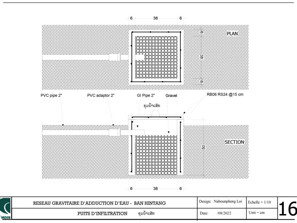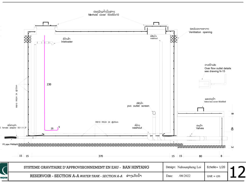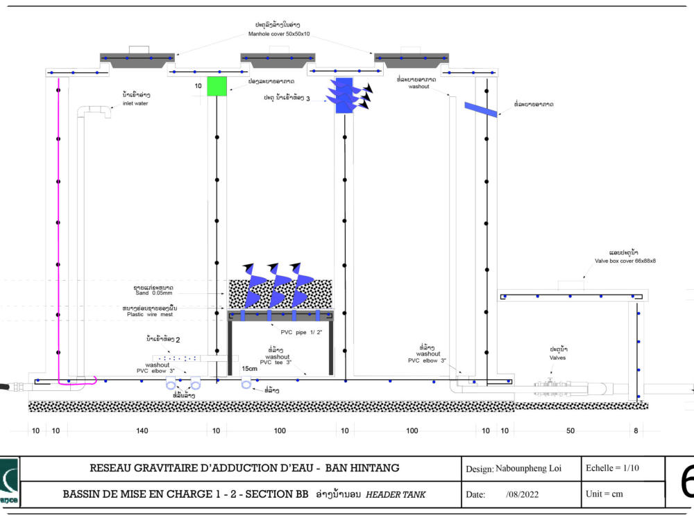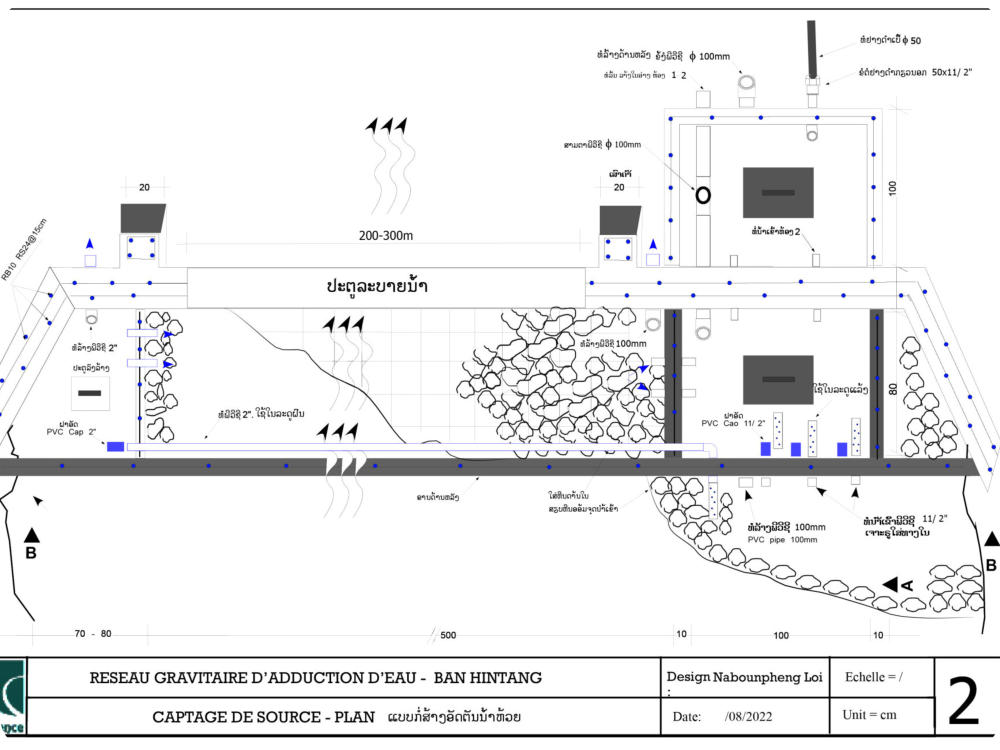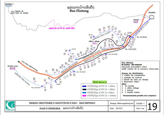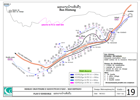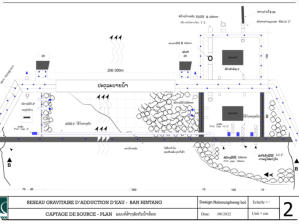 Le village est alimenté par un réseau gravitaire construit en 2009 par Confluence. Ce réseau capte un ruisseau d’un débit de un Litre/seconde, situé à 8km du village , dans le village de Houay Hao. Un accord formel existe déjà entre les deux villages quant à la protection et l’utilisation de ce ruisseau. Le réseau est équipé d’un Bassin de Mise en Charge (BMC), d’un Bassin Brise Charge (BBC) et d’un réservoir de 12 alimentant 7 bornes fontaines. L’ensemble de ces infrastructures est en bon état. Un comité de gestion de l’eau a été formé par Confluence dès 2009 et qui est toujours opérationnel. Le comité assure la maintenance du réseau et collecte auprès de chaque ménage une redevance annuelle allant de 15 000 à 20 000 kips en fonction de la taille du ménage. Malgré une situation encourageante, les communautés font face à plusieurs problèmes : 1 . Construites il y a plus de 10 ans, les principales infrastructures (captage, BMC, réservoir) sont sous-dimensionnées face à l’augmentation de la population et des besoins. 2 . La canalisation principale reliant la source au village est fortement endommagée sur près de 2 km . Le comité de l’eau ne dispose pas des ressources financières suffisantes pour assurer un tel remplacement et en est réduit à conduire des réparations sommaires qui ne règlent que partiellement les fuites. La quantité d’eau atteignant le village est donc plus faible que la quantité disponible à la source. Il en résulte un manque d’eau et des tensions entre les villageois. 3 . L’école est construite à une altitude plus élevée que le réservoir du village et n’est donc pas alimentée en eau. Face à ces difficultés, le village a demandé au district de Phonxay de l’aide afin de remettre à niveau le réseau. Le village a également demandé la mise en place d’un réseau à branchements privatifs.