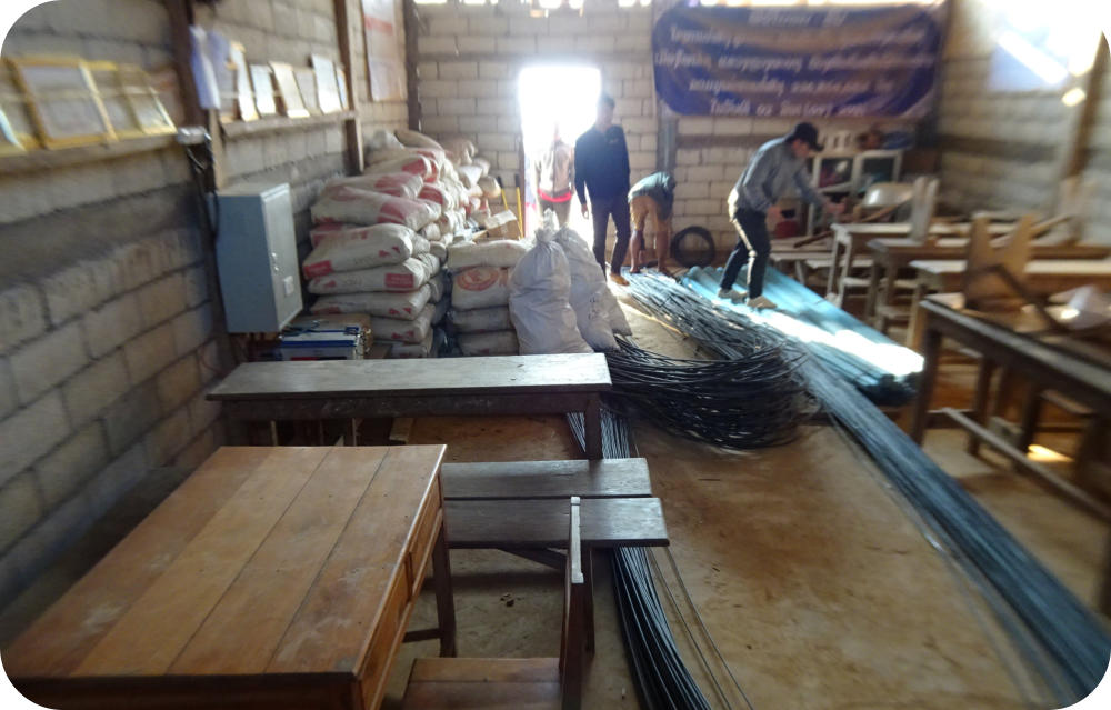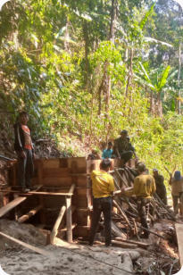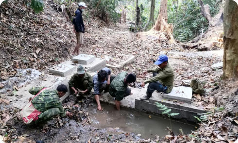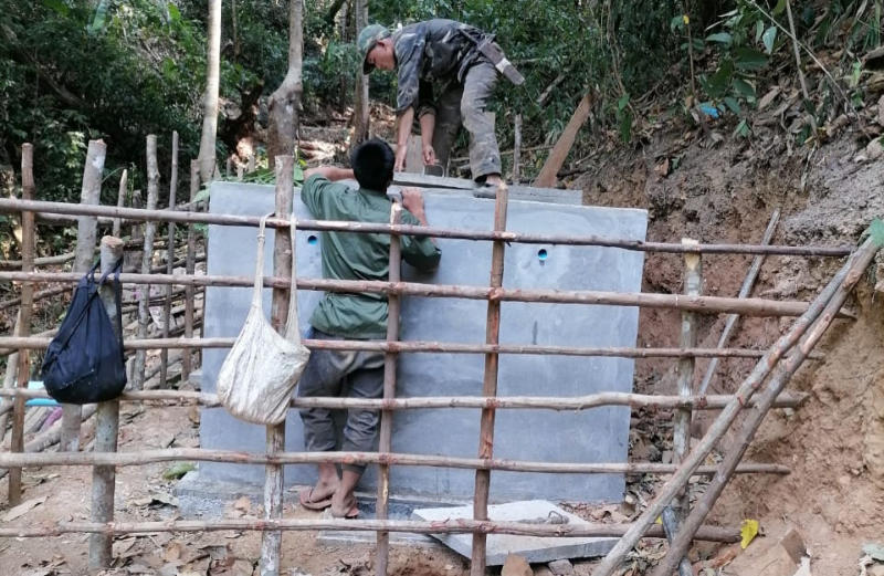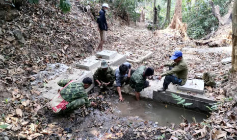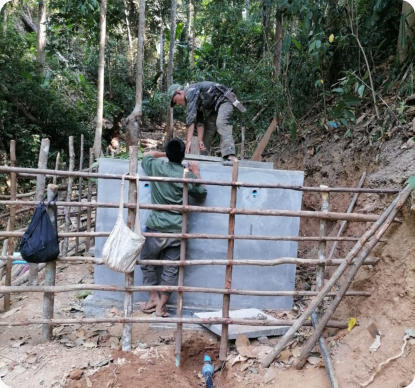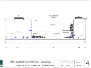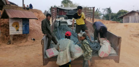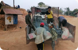 La zone de captage est une source résurgente située à 10 km de Hintang sur un terrain appartenant au village de Houay Hao. Un accord est intervenu entre ces 2 villages et ce terrain est devenu « zone protégée » (aucune culture ou pâture). Les matériaux sont livrés par l’entreprise de Luang Prabang qui a été sélectionnée suite à l’appel d’offres. Sur place les villageois assurent le transport sur sites avec des engins agricoles surbaissés à 4 roues motrices, mais très souvent « à dos d’homme », on devrait plutôt dire « à dos d’humain » car les femmes et les jeunes-filles participent largement au transport du sable, du gravier et du ciment.