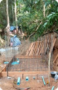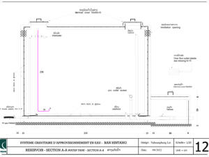 I l a fallu pas moins de 10 missions préparatoires pour déterminer la zone de captage et l’ensemble du système avec les différents ouvrages. En raison de l’éloignement de la source les maçons ont dormi sous tente sur place pendant la durée de la construction du bassin de captage et du bassin de mise en charge situé à une trentaine de mètres en contrebas. En raison de 2 mois de construction il a été noté une certaine lassitude de la population qui a entraîné une légère démotivation des maçons mais au final le système a été pleinement achevé.