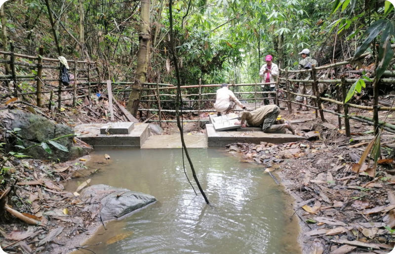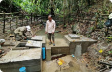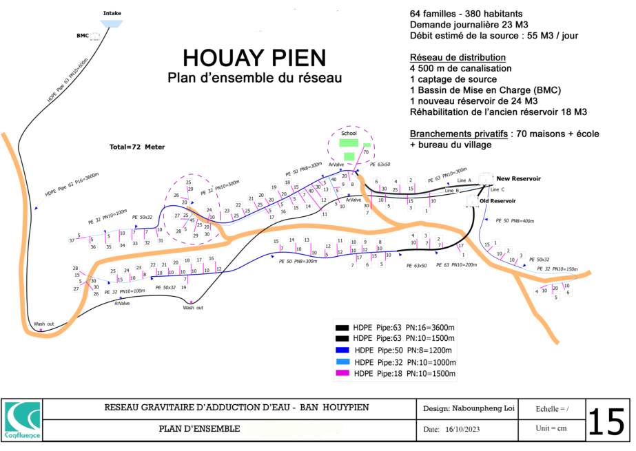 Le village de Houay Pien, très difficilement accessible à la saison des pluies, connait une grande précarité d’accès à l’eau en raison de l’état vétuste de son réseau d’eau construit en 2005 par une ONG. Un réservoir supplémentaire a été construit en 2014 pour alimenter la partie supérieure du village. Le captage est petit et vétuste , au même titre que le bassin de mise en charge qui ne possède pas de système de filtration. Le réseau se bouche immédiatement en cas de fortes pluies. L’adduction principale est également en mauvais état . Longue de plus de 4 km, elle souffre d’un fort dénivelé alors qu’aucun bassin brise charge n’a été installé et que la conduite ne peut supporter une telle pression. Les ruptures de canalisations sont fréquentes, laissant le village sans eau tant qu’elles ne sont pas réparées. Si les deux réservoirs sont en bon état, ils ne sont cependant plus approvisionnés . En raison des problèmes sur l’adduction principale, la pression n’est pas suffisante pour permettre l’alimentation des réservoirs en continu. Les villageois ont donc mis en place un point d’accès unique directement sur l’adduction, en contrebas du village .