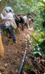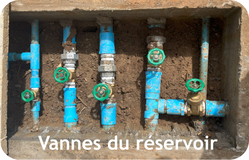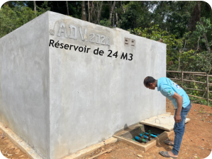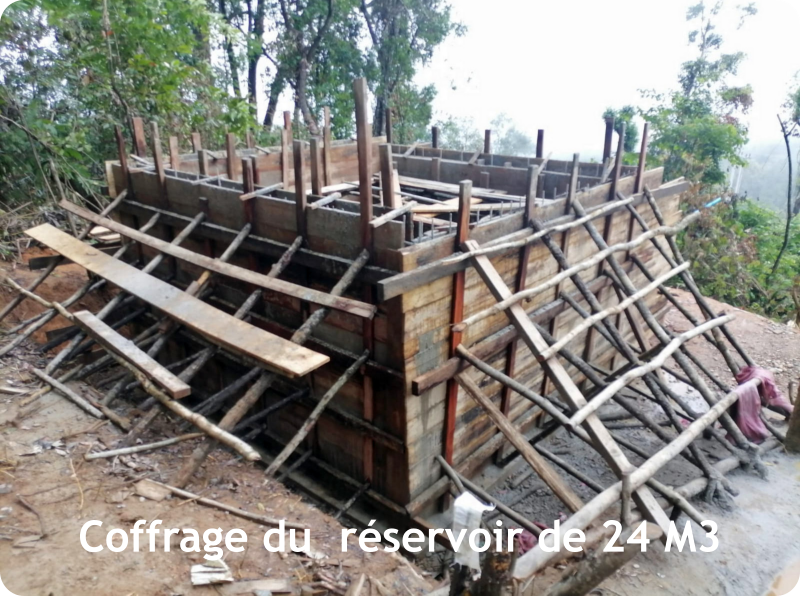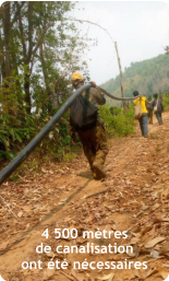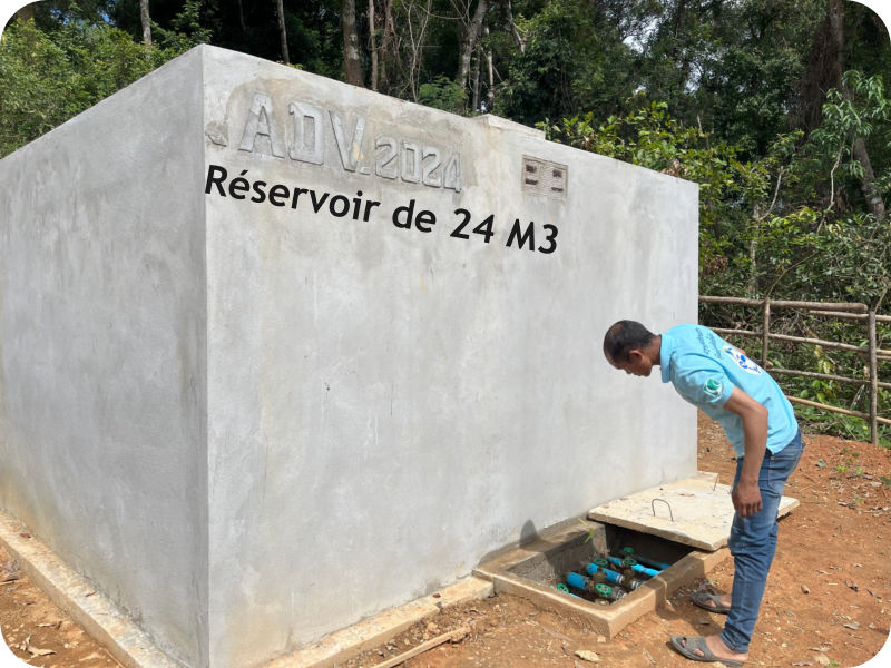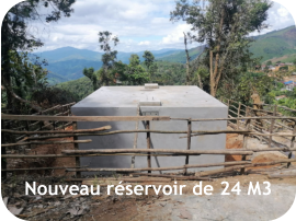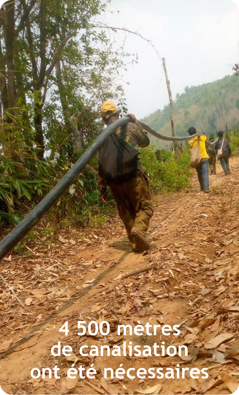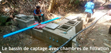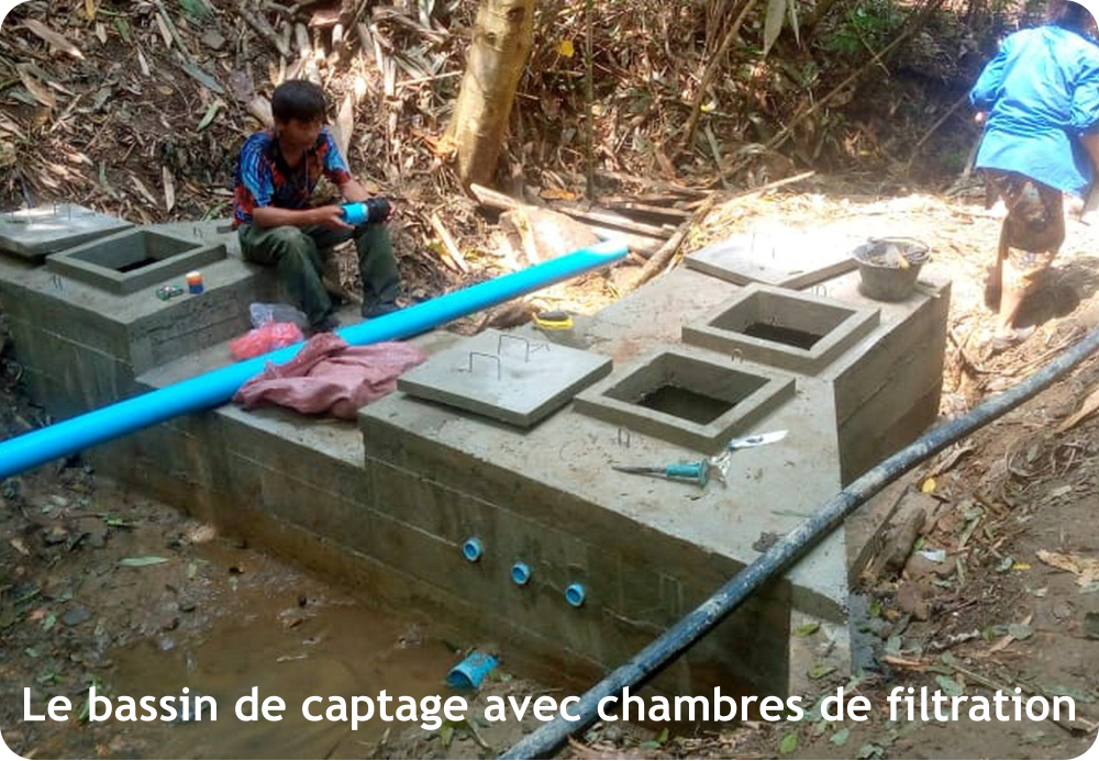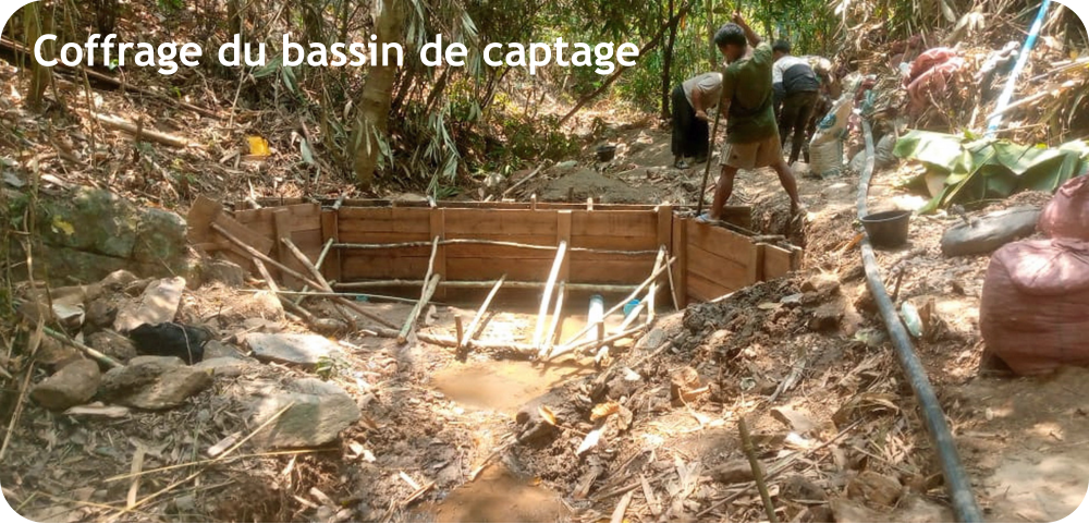 avec le soutien de 	1.	Construction d’un captage protégé sur le ruisseau actuellement utilisé 	2.	Construction d’un bassin de mise en charge (BMC) avec filtration 	3.	4 500 mètres d’adduction principale en PN 16 (résistance pression) 	4.	Construction d’un réservoir de 24 M³ avec réhabilitation de l’ancien réservoir 	5.	Installation d’un réseau de canalisations secondaires dans le village  	6.	Réseau de distribution de 72 branchements privatifs avec compteurs pour 70 constructions + école + bureau du village