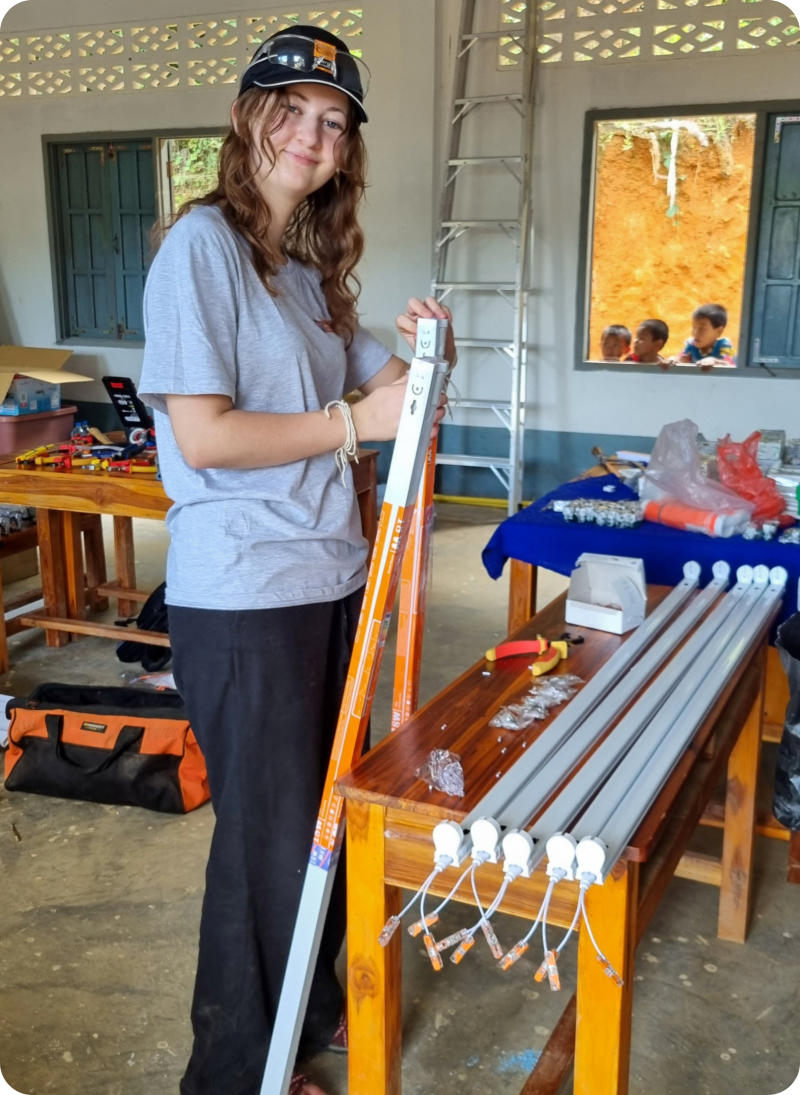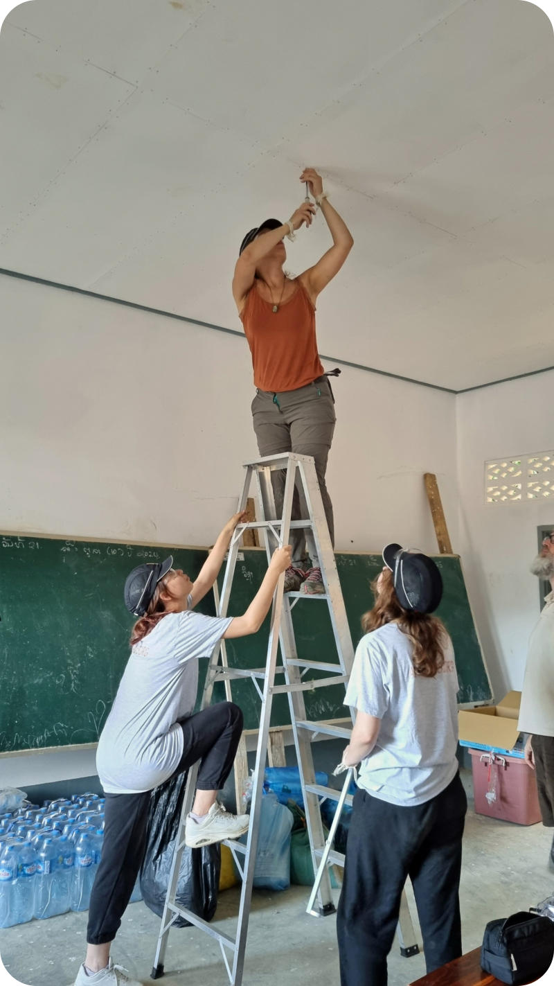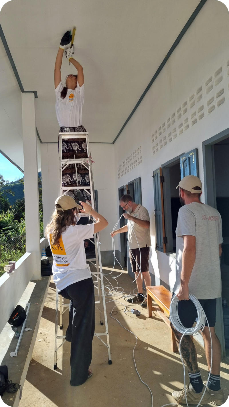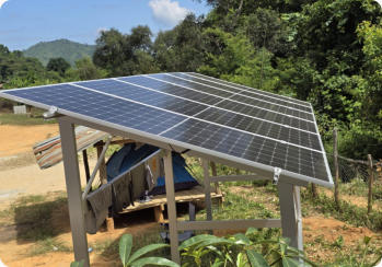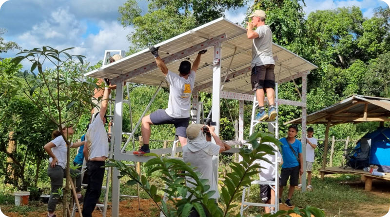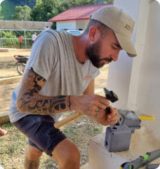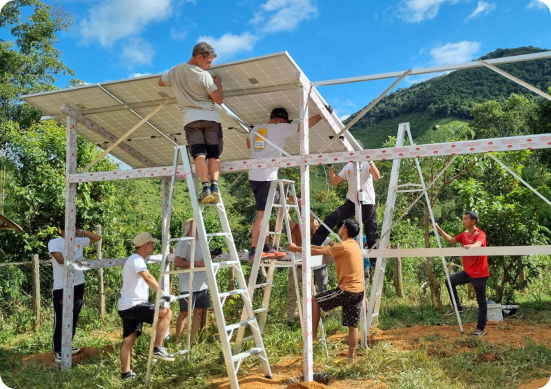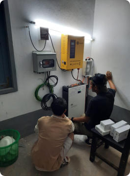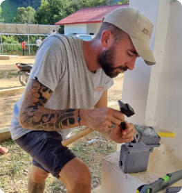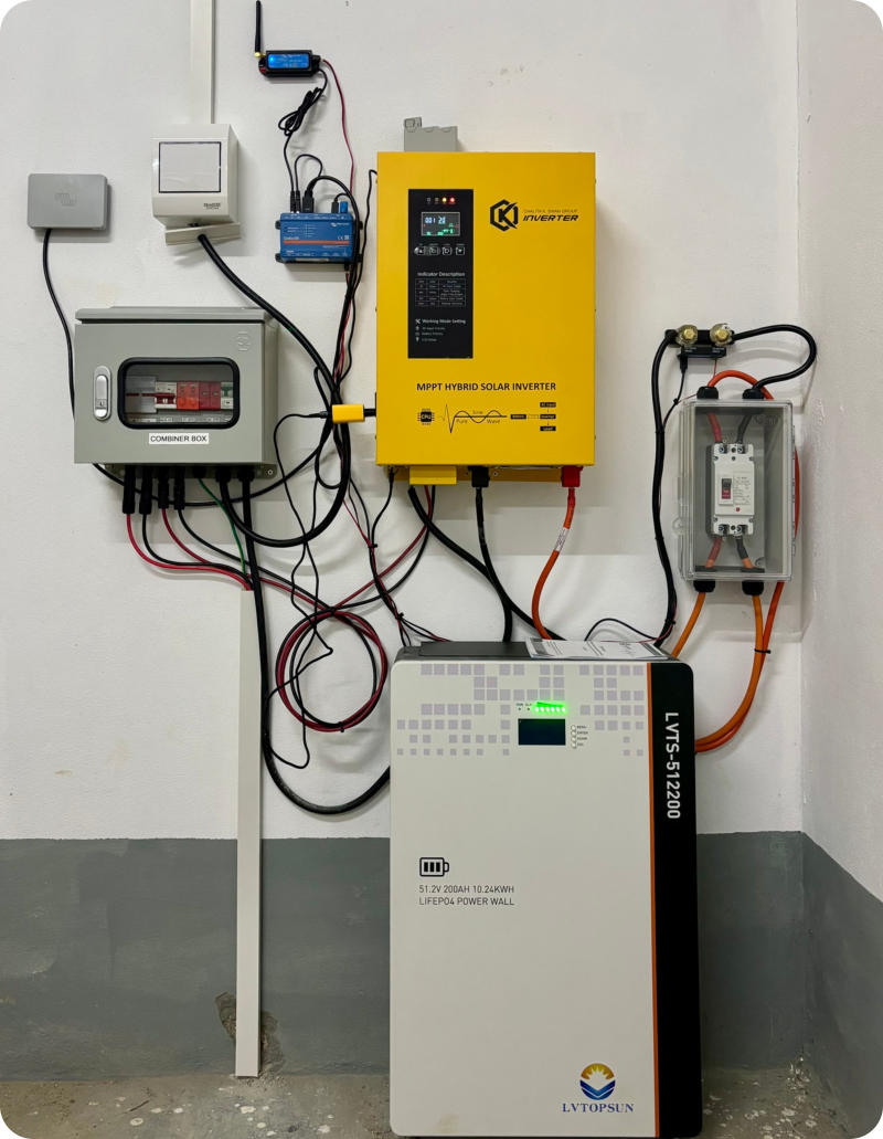: câblage des panneaux solaires vers onduleur et batterie, connectique, tuyau PVC, tige de terre, etc.